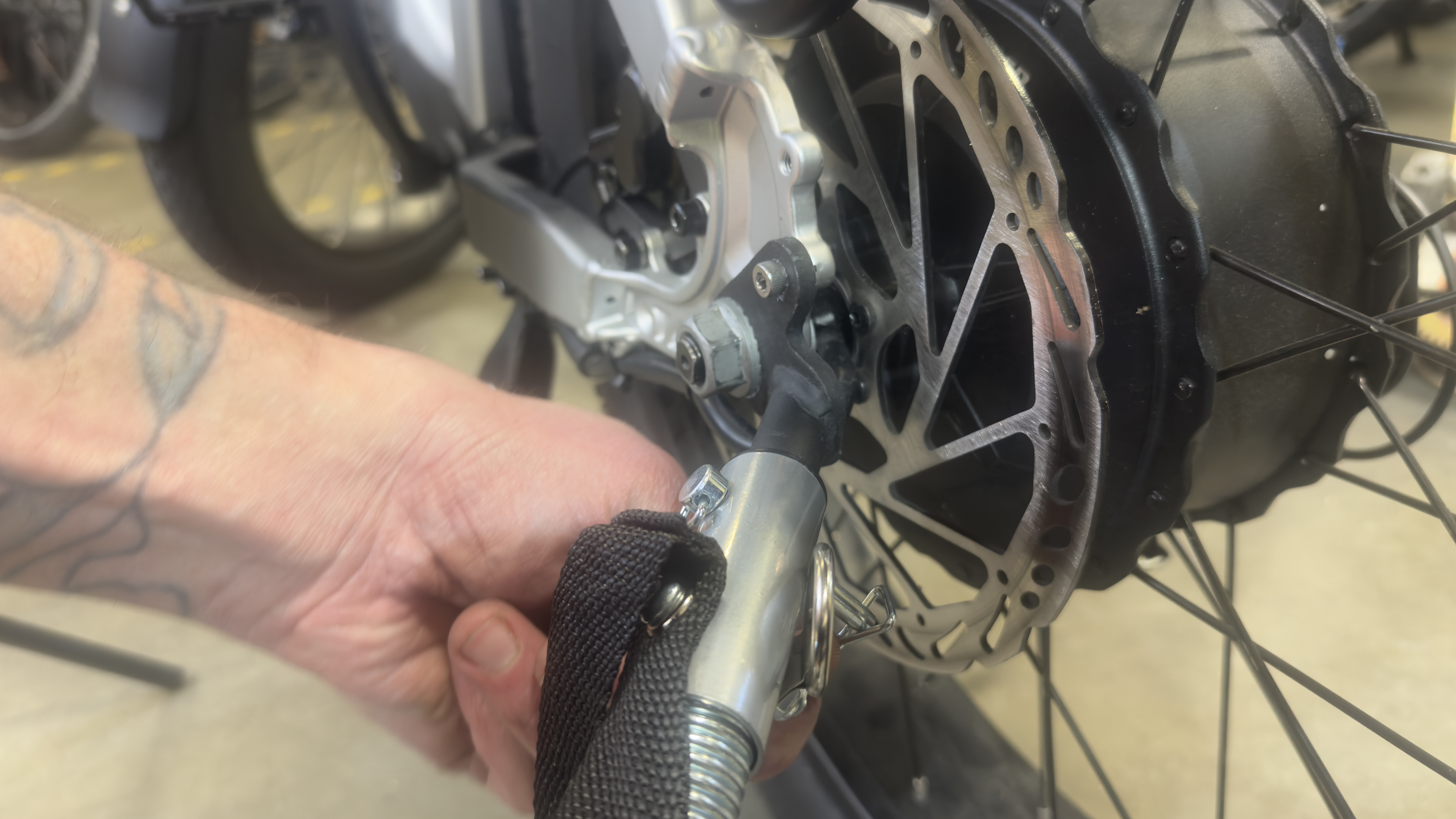 - Remove the torque arm bolt and the torque arm then replace it with the trailer hitch use the provided m5 bolt to secure the hitch